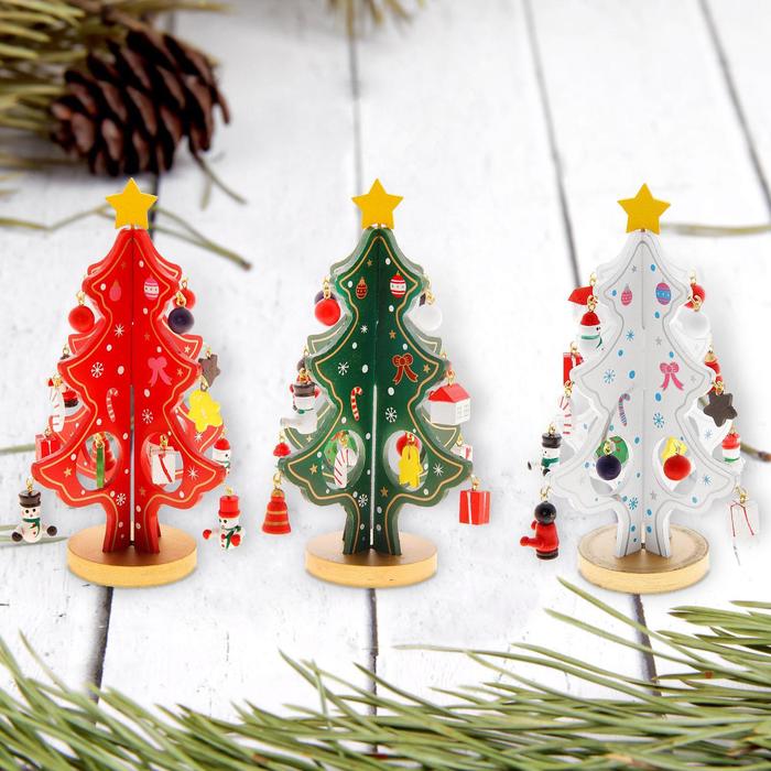 Симпатичные интересные подвески можно расположить по своему вкусу, а золотая звёздочка на макушке завершает тожественный образ лесной красавицы. Деревянная ёлочка на подставке не замёт много места и будет радовать взор в зимние праздники на протяжении многих лет.
