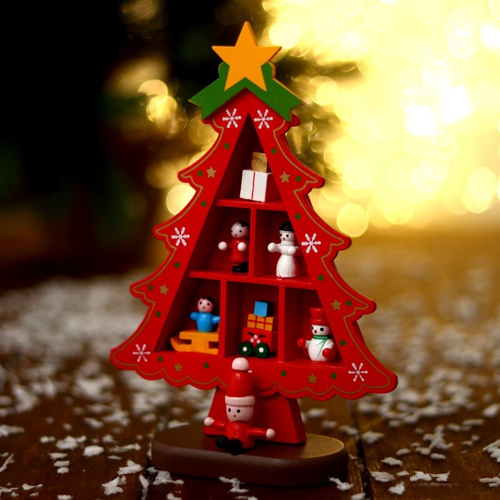 Симпатичные интересные подвески можно расположить по своему вкусу, а золотая звёздочка на макушке завершает тожественный образ лесной красавицы. Деревянная ёлочка на подставке не замёт много места и будет радовать взор в зимние праздники на протяжении многих лет.