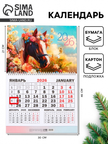 Календарь настенный квартальный 2026 «Лошадь с котенком», 30×46 см