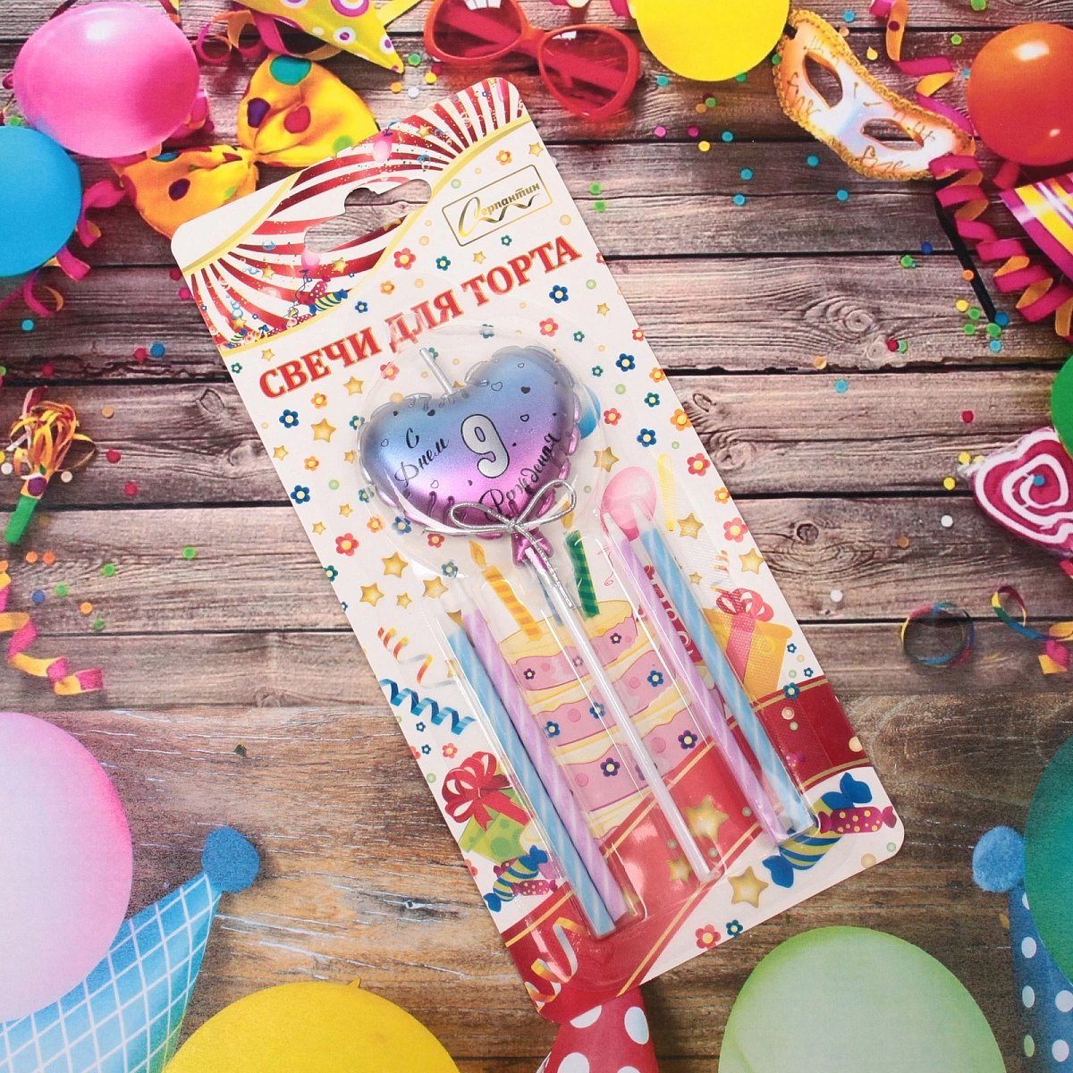 Свечи для торта Цифра Воздушное сердце "9" (свечи 8 см, сердце 5*13 см)
