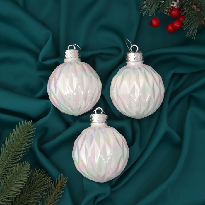 Набор из трёх белоснежных ёлочных шаров диаметром 8 см с гранями выполнен в сочетании датского и скандинавского стилей с классическими элементами. Пластиковые украшения с перламутровым эффектом создают лёгкую и элегантную атмосферу новогоднего праздника, подчёркивая простоту и изящество праздничного декора.
