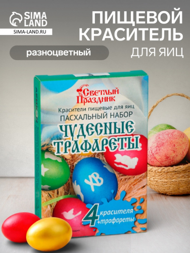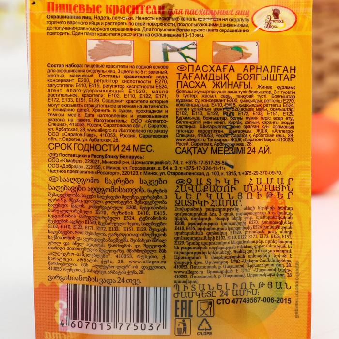 Набор для окрашивания пасхальных яиц представляет палитру из трех цветов. Красители абсолютно безопасны и порадуют Вас и Ваших близких ярким и насыщенным цветом.