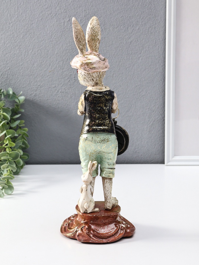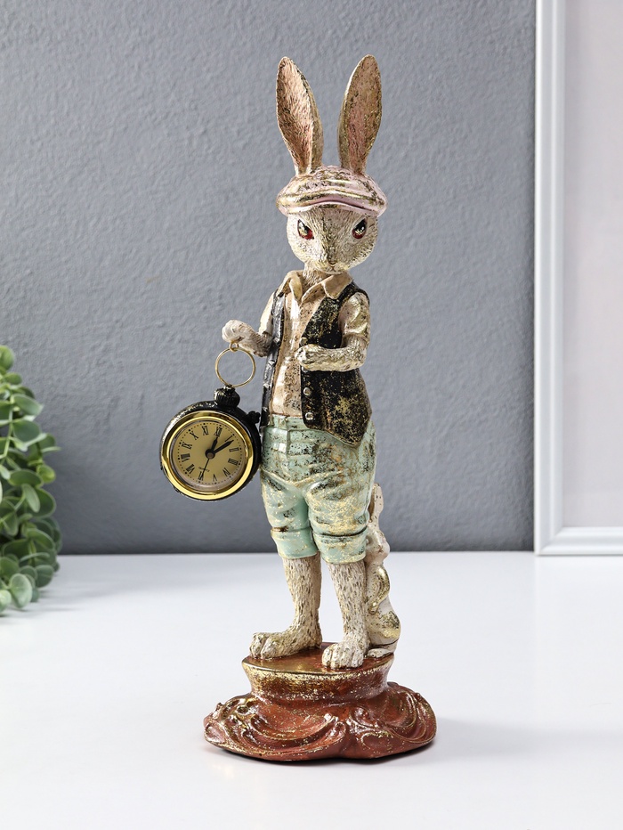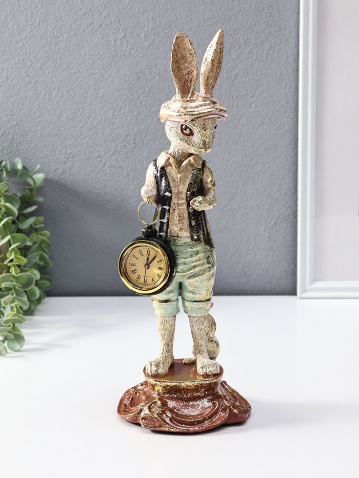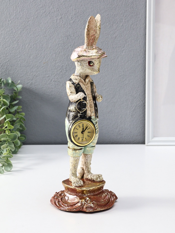 Эта настольная фигурка с часами станет очаровательным акцентом в интерьере и практичным подарком на Пасху или любой другой праздник. Зайчик в кепке, выполненный из прочного полистоуна, держит в лапках классические часы, создавая уютную и немного ностальгическую атмосферу.
