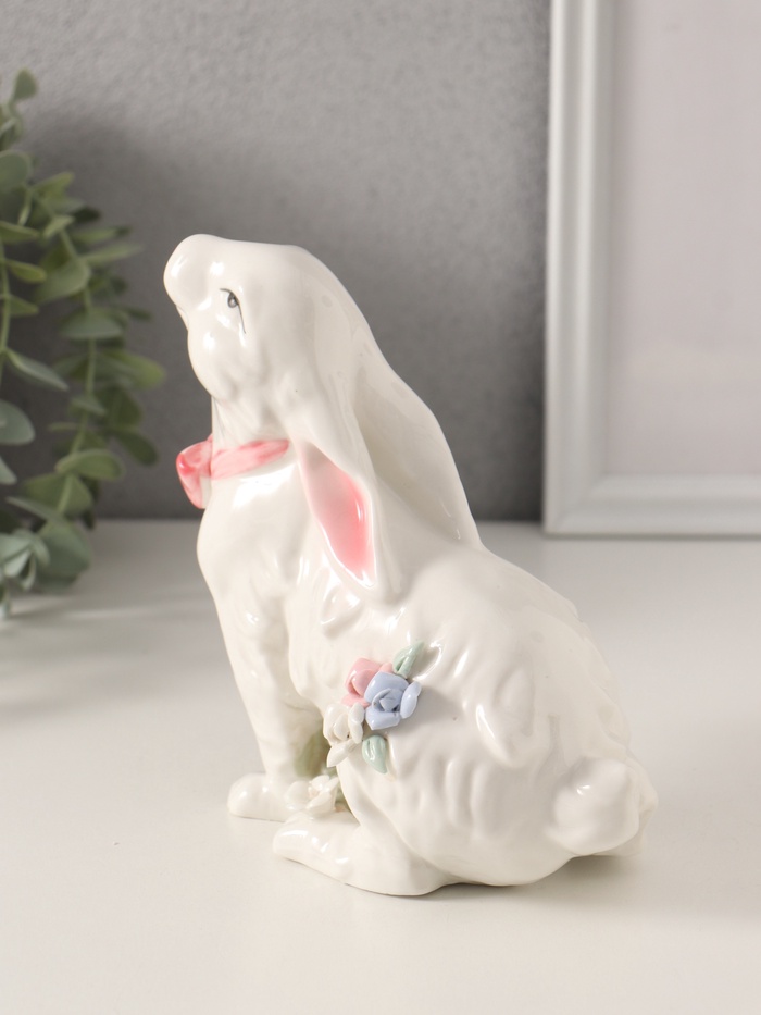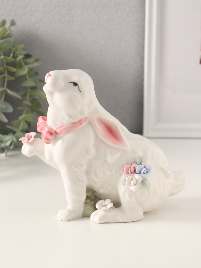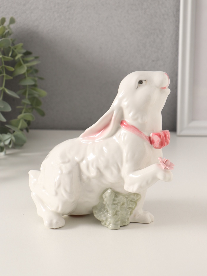 Эта керамическая фигурка белого кролика с розовым бантом и розочками станет очаровательным украшением вашего интерьера, добавляя ему нотку нежности и уюта. Её белый цвет с акцентами розового подчеркивает изящество и детализацию, а высота в 16 см делает её компактным, но заметным элементом декора. Фигурка передаёт атмосферу весны и праздника, идеально вписываясь в тематику Пасхи, 8 Марта или просто как универсальный декор.