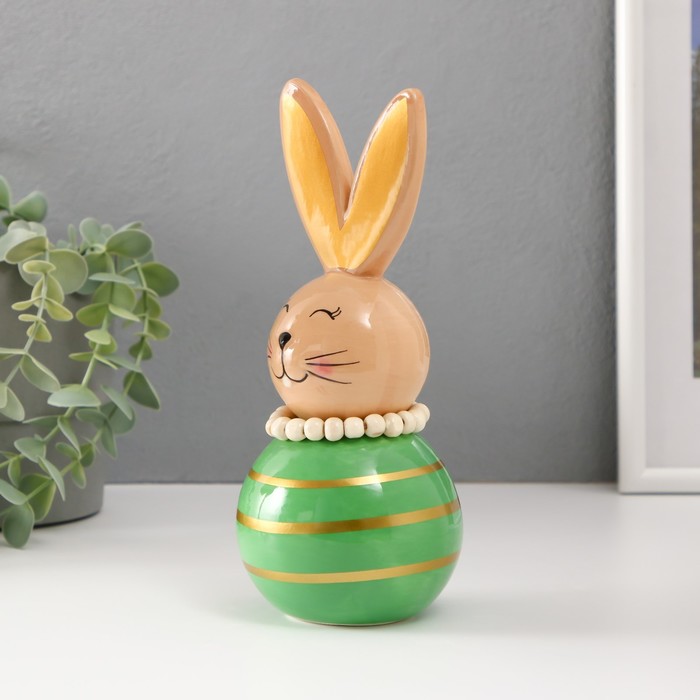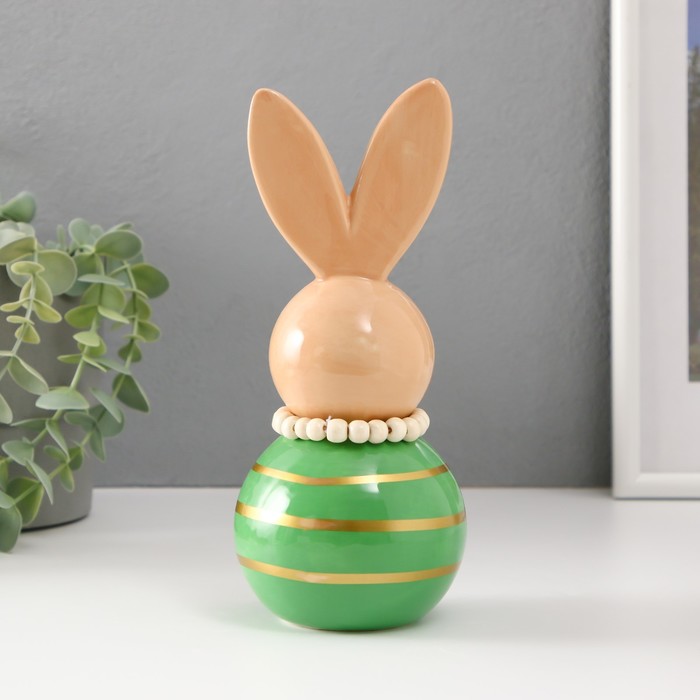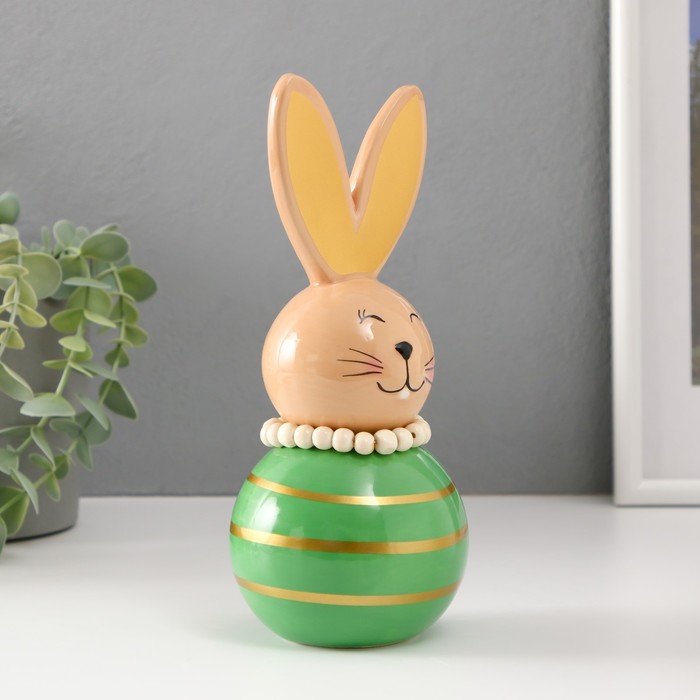 Представляем очаровательную керамическую фигурку, которая наполнит ваш дом атмосферой тепла и весеннего настроения. Этот зайка-неваляшка с полосками в бежево-зелёных тонах станет символом радости и семейного уюта, создавая особую атмосферу праздника. Его размеры — 8.5×8.5×20 см — делают его универсальным решением для украшения полок, столов или даже открытых пространств.