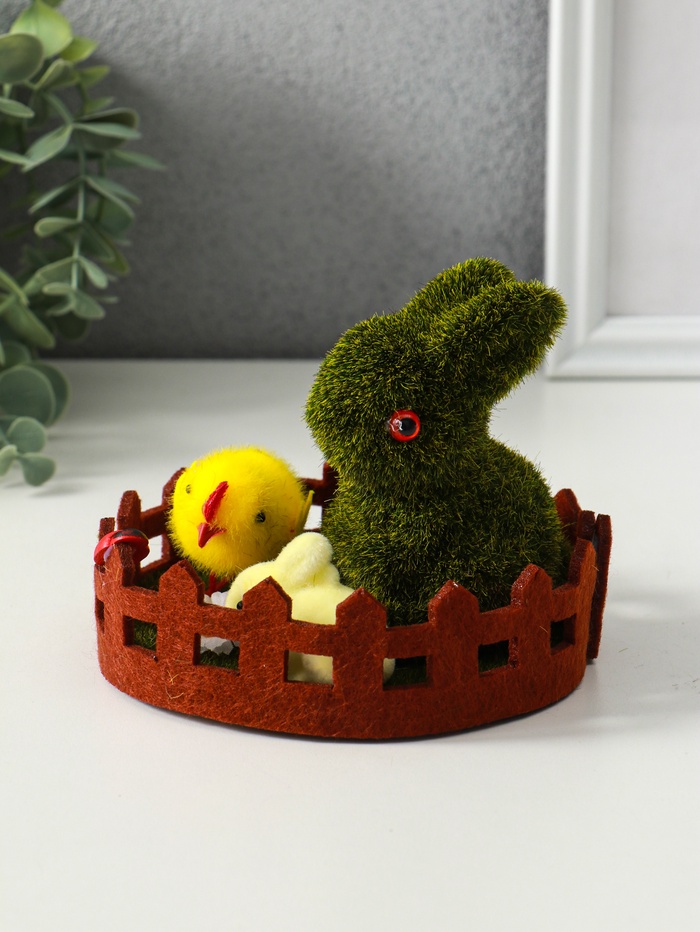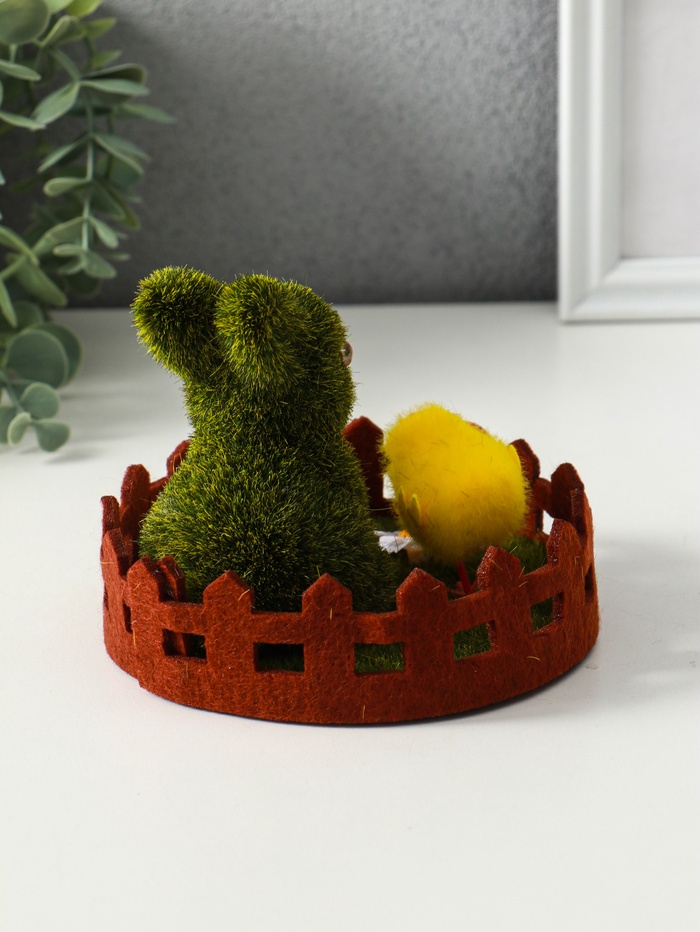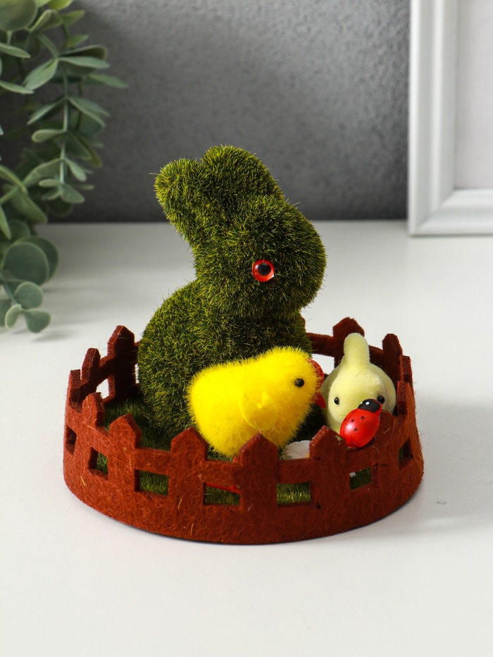Эта пасхальная фигурка с зайчиком создаёт тёплую весеннюю атмосферу в вашем доме. Композиция из уютного фетра и лёгкого пенопласта изображает трогательную сцену: кролик на лужайке в окружении цыплят. Она станет сердцем праздничного декора, напоминая о пробуждении природы и семейном уюте. Универсальное оформление позволяет украсить интерьер не только на Пасху, но и в любое время года, даря ощущение доброй сказки.