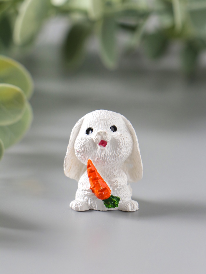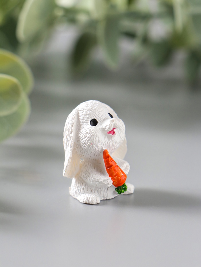 Эта миниатюрная фигурка белого зайчика — олицворение нежности и весеннего пробуждения. Маленький кролик, застывший в момент удивления с бабочкой и морковкой, создаёт тёплую и умиротворяющую атмосферу в любом уголке вашего дома. Компактный размер делает его идеальным акцентом для праздничного стола, пасхальной композиции или полки с памятными безделушками.