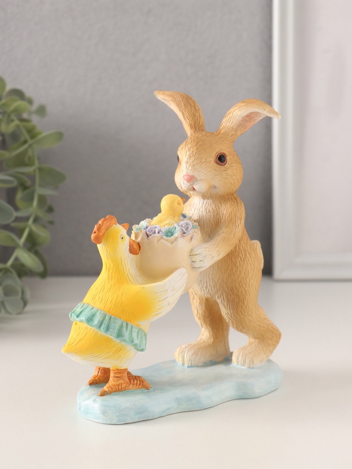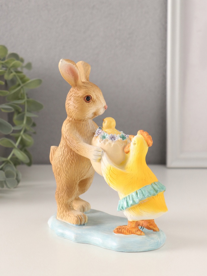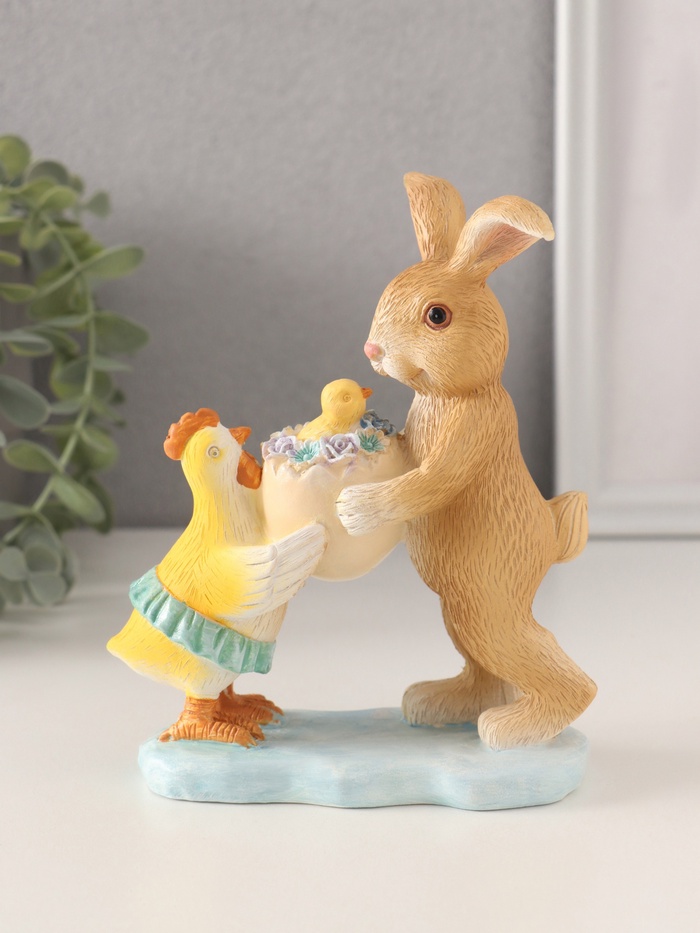 Представляем вашему вниманию очаровательную композицию, изображающую зайчика и курочку с цыплёнком в скорлупе. Высотой 14 см, эта фигурка привлекает внимание своей трогательностью и детализированной проработкой. Разноцветные оттенки добавляют изделию яркости и делают его универсальным решением для любого интерьера.