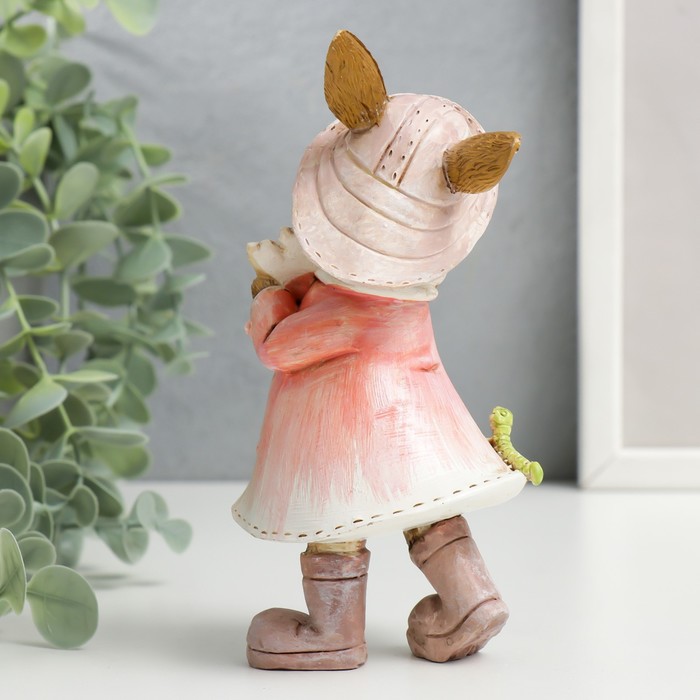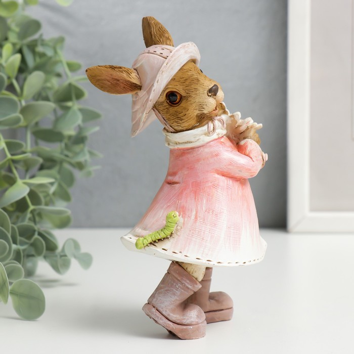 Эта фигурка зайчика в дождевике станет тёплым напоминанием о простых радостях. Маленький кролик под зонтиком-цветком, с любопытной гусеницей на рукаве, словно замер в ожидании весеннего солнца после тёплого дождя. Универсальная статуэтка создаёт уютное настроение в интерьере каждый день.