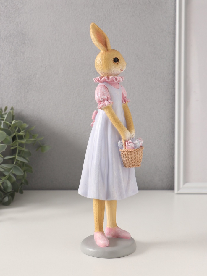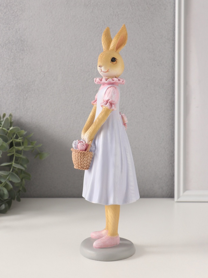 Эта фигурка зайчика в сиреневом платье станет тёплым напоминанием о весне, домашнем уюте и простых радостях. Она словно застывший миг из доброй сказки: кролик с корзинкой полевых цветов готов подарить улыбку и украсить ваш интерьер.