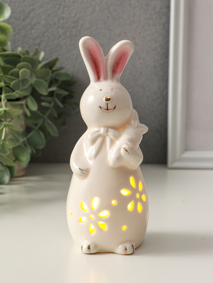 Эта светящаяся керамическая фигурка — тёплый лучик света в интерьере и символ уюта. Милый зайчик с морковкой создаёт мягкое, умиротворяющее свечение, превращая обычный вечер в момент спокойствия. Белоснежная глазурь и лаконичная форма делают его универсальным акцентом для полки, рабочего стола или праздничного стола.