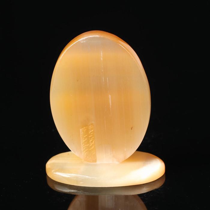 Селенит — это материал, который относится к разновидности гипса, жёлто-розового цвета с шелковистым блеском. Внутренние волокна расположены плотно, это даёт эффект «кошачьего глаза». Изделия из селенита завораживают игрой света, нежными тонами и хрупкостью. При прикосновении есть ощущение исходящей энергии.