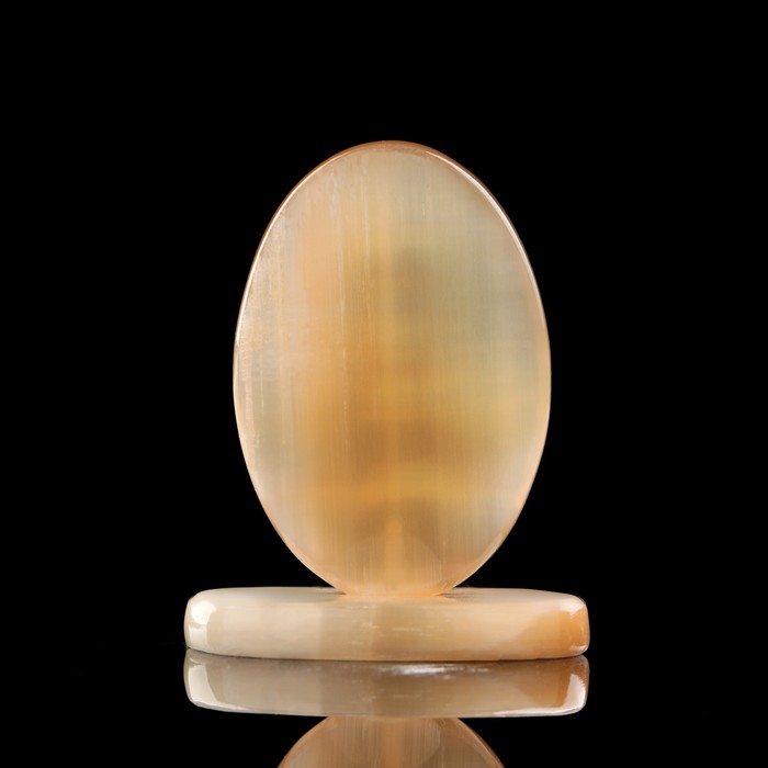 Селенит — это материал, который относится к разновидности гипса, жёлто-розового цвета с шелковистым блеском. Внутренние волокна расположены плотно, это даёт эффект «кошачьего глаза». Изделия из селенита завораживают игрой света, нежными тонами и хрупкостью. При прикосновении есть ощущение исходящей энергии.
