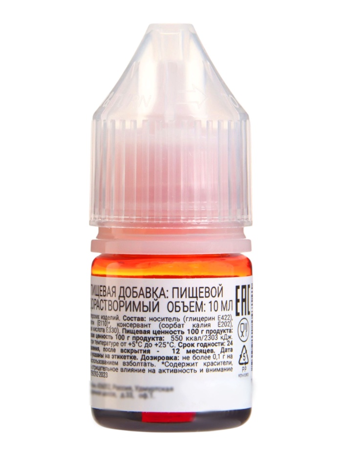 * Сочный оранжевый цвет: Краситель даёт чистый оттенок от нежного абрикосового до насыщенного мандаринового. Регулируйте насыщенность парой капель, добиваясь нужного тона на скорлупе или в десертах.