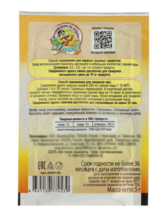 * Простота использования: Разведите порошок в горячей воде, добавьте столовую ложку уксуса для закрепления цвета и опустите вареные яйца на 3–5 минут. Время окрашивания влияет на насыщенность: для светлого сливочного оттенка достаточно 2 минут, для насыщенного желточного — 5–7 минут.