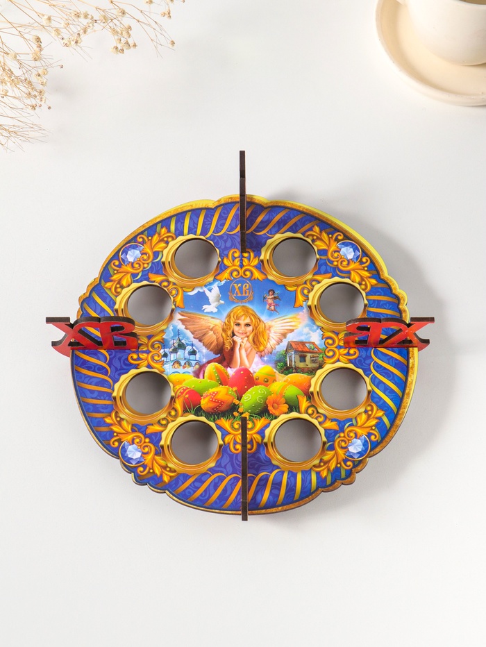 Эта пасхальная подставка для яиц превратит праздничный стол в трогательную и светлую композицию. Восемь аккуратных ячеек надежно удержат крашенки, создавая цельный и гармоничный образ. Изображение ангела привносит в традиционную пасхальную атрибутику ноту умиротворения и тепла.