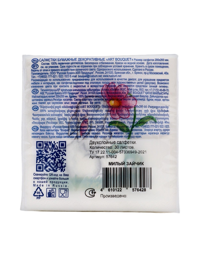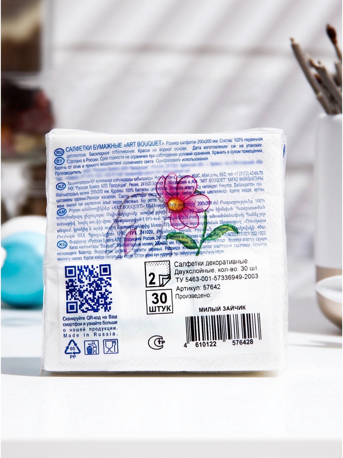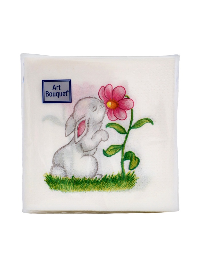 Пасхальные сервировочные бумажные салфетки Art Bouquet с рисунком «Милый зайчик» - это отличное украшение для вашего праздничного стола. Идеально подойдут как для сервировки, так и в качестве декора и украшения в домашних условиях или на больших мероприятиях. Праздничные салфетки с пасхальным рисунком будут хорошим подарком для родных и близких. Данные салфетки можно использовать так же для декупажа и коллажей.