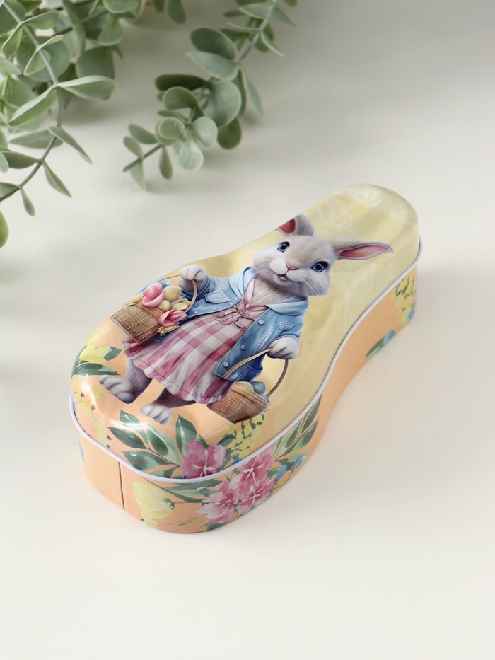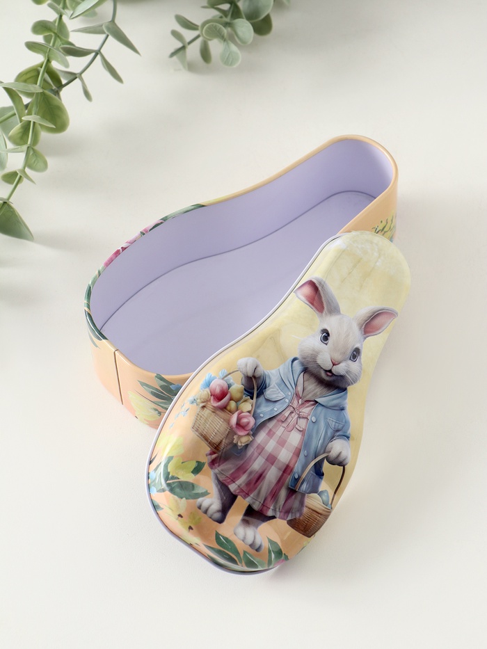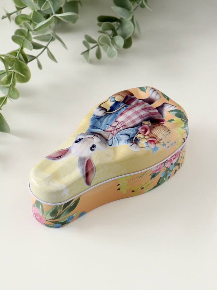 Эта металлическая шкатулка с зайкой — очаровательный способ хранить мелкие ценности. Её фигурный дизайн с изображением корзинок, цветов и пасхальных яйцев создаёт постоянное весеннее настроение. Компактный размер делает её идеальным аксессуаром на туалетном столике или письменном столе.