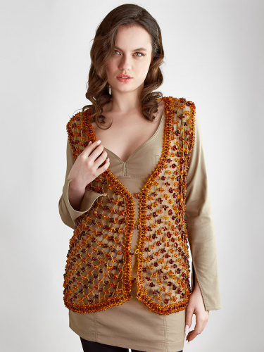 Необычный и стильный аксессуар порадует любительниц оригинальных и эксклюзивных вещей. Эффектный жилет вручную связан из бисера и цельных глянцевых кусочков натурального балтийского янтаря. Безрукавку можно надевать поверх водолазок, лёгких трикотажных платьев, сочетать с кожаными леггинсами, джинсами, шортами. Эта необычная и яркая деталь вашего гардероба поможет создать вам множество незабываемых образов, а ласково окутывающий вас натуральный янтарь подарит хорошее настроение в любой день.