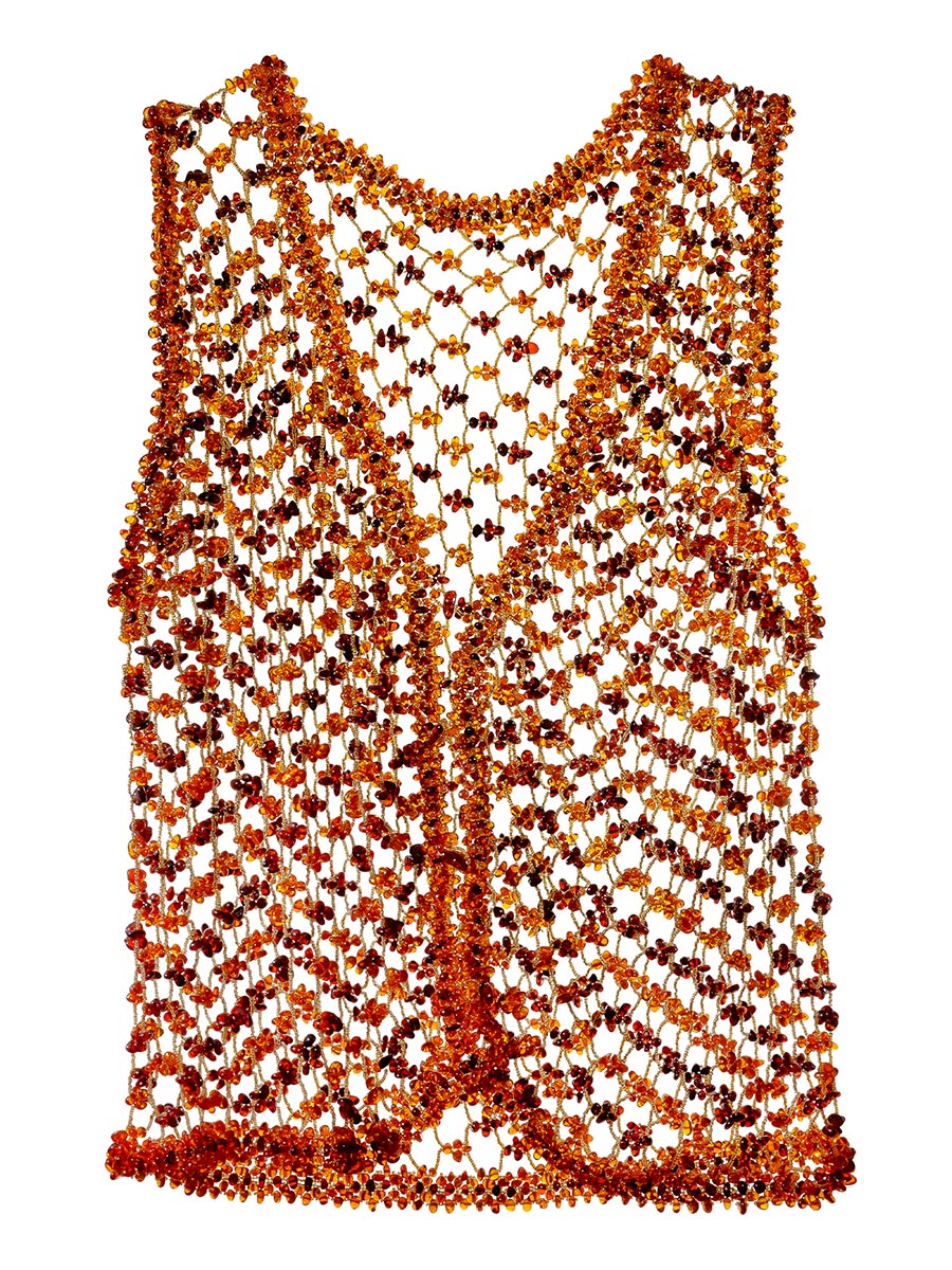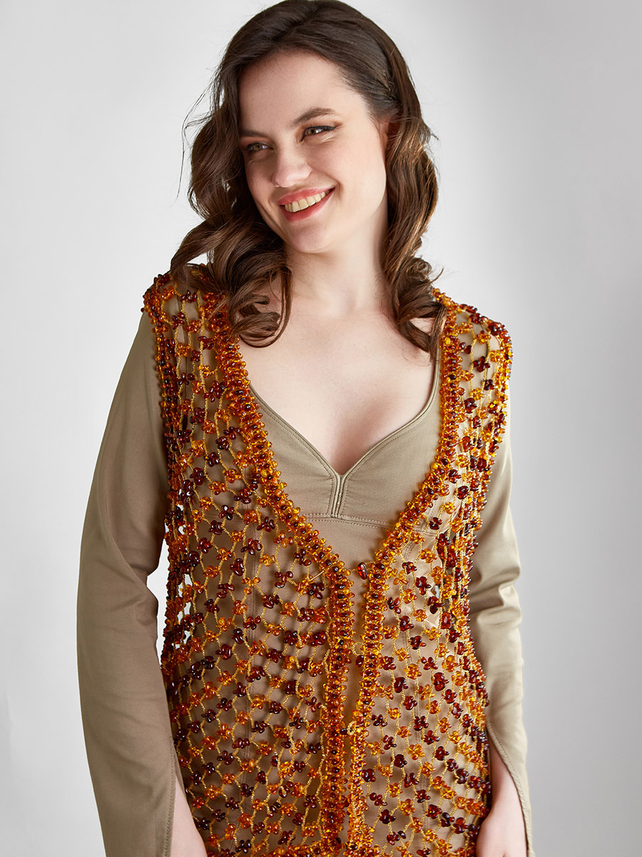 Ажурный вязаный жилет из натурального янтаря и бисера