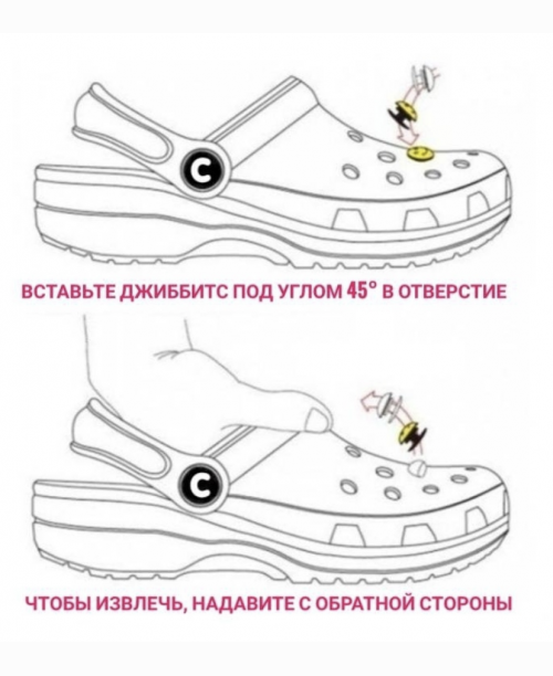 Клипсы-украшения легко устанавливать и извлекать. При слишком узких отверстиях рекомендуем нагреть обувь феном для эластичности (горячее отверстие отлично растягивается и позволяет продеть либо извлечь клипсу).