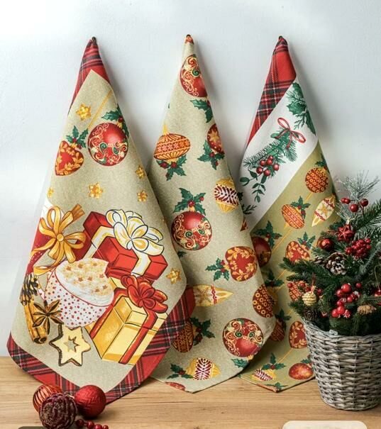 К-т полотенец "Елочные игрушки" 50*60 см. - 3 шт. рогожка хлопок 100%