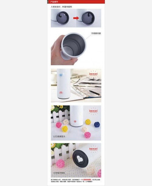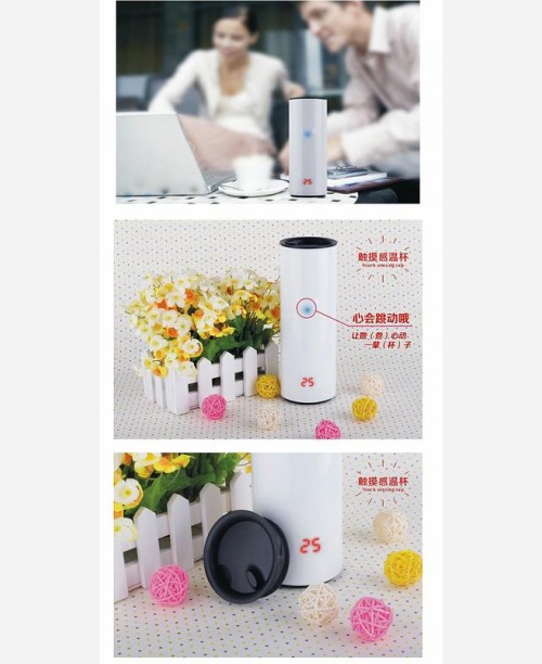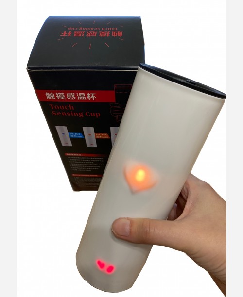 Включается автоматически. При прикосновении к наружной стенке начинает мигать индикатор в виде сердца, меняя цвет в зависимости от температуры напитка. Для большей информативности в нижней части кружки присутствует дополнительный индикатор, который показывает точную температуру напитка.