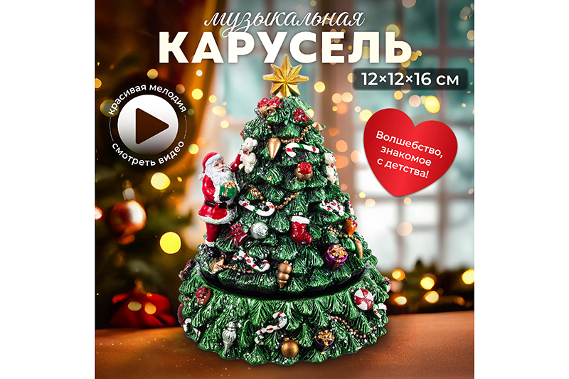 Музыкальная карусель «Рождественская ель» от Elan Gallery – это маленькое путешествие в дивный мир зимней сказки. Её размер – 12x12x16 см. Выполнена из полистоуна – современного материала, который славится своей прочностью, износостойкостью и устойчивостью к перепадам температур. Он не подвержен деформации и не выделяет вредных веществ. Полистоун легко поддаётся обработке, поэтому изделия из него отличаются высокой детализацией. На красивой зелёной ёлке развешаны новогодние украшения: шары, конфеты и другие символы праздника, а также большая фигурка Деда Мороза с подарком. Поверхность присыпана блёстками, напоминающими снежинки. Верхушку венчает большая золотая звезда. Основание оснащено мягким противоскользящим покрытием. Механическое изделие не требует зарядки и батареек – достаточно повернуть верхнюю часть ёлки по линии механизма. Крутящаяся фигурка проигрывает приятную рождественскую музыку, навевая воспоминания о тёплых вечерах, проведённых в кругу семьи. Время – 3-4 минуты в зависимости от силы завода. Поставьте милую настольную фигурку на комод, полку или возле компьютера, чтобы добавить интерьеру дух любимых зимних праздников. Оригинальная игрушка в стиле винтаж станет прекрасным сувениром на память и отличным подарком для друзей и близких. Благодаря яркому дизайну фигурное декоративное изделие понравится ребёнку, подростку или взрослому. Подойдёт как девочке, так и мальчику. Оно послужит необычным инвентарём для декора вашего дома. Поставляется в красной картонной коробке – благодаря ей вам не потребуется дополнительная подарочная упаковка. Музыкальная карусель от бренда Элан Галерея поможет вам погрузиться в атмосферу Нового года и Рождества и наполнит дом уютом и светлой праздничной магией! /