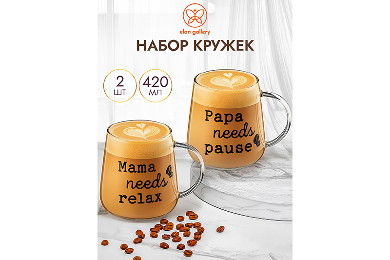 Набор 2 кружек из серии Crystal glass от Elan Gallery предназначен для эстетичной сервировки вашего стола. Размер каждой ёмкости – 11,5*9*9,5 см, объём – 420 мл. Выполнены из термостойкого боросиликатного стекла. Жаропрочный материал выдерживает от -20 °C до +150 °C и позволит наслаждаться напитками любой температуры. Не имеет в составе вредных веществ, не впитывает запахи и вкусы. Прозрачную поверхность изделий украшают декоративные надписи «Mama needs relax» («Маме надо расслабиться») и «Papa needs pause» («Папе нужна пауза»). Кофейные кружки помогут провести множество приятных завтраков с капучино и латте, а также уютные чайные вечера с конфетами, вафлями и другими десертами и сладостями. Подойдут ценителям чая и кофе, которые любят пить из красивой и необычной посуды. Согрейтесь зимой любимым напитком: какао с маршмэллоу, ягодным чаем или горячим шоколадом. Летом освежитесь домашним лимонадом или морсом. Парные кружки станут идеальным дополнением романтического чаепития или уютного семейного ужина. Не рекомендуется применять абразивные моющие средства. Подходят для использования в микроволновой печи. Не подходят для посудомоечной машины. Поставляются в дизайнерской картонной коробке – благодаря ей вам не потребуется дополнительная подарочная упаковка. В серии Crystal glass можно найти много разнообразных кувшинов и графинов, которые подходят для горячей жидкости. Красивая посуда, кухонный инвентарь и товары для дома от бренда Элан Галерея позволят создать уют на вашей кухне или в столовой! /