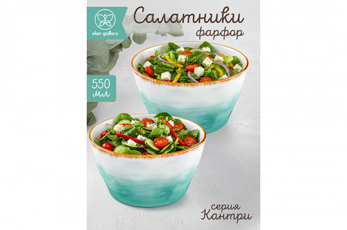 Набор 2 салатников из серии «Кантри» от Elan Gallery предназначен для эстетичной сервировки вашего стола. Размер каждого изделия – 13,5х13,5х7,5 см, объём – 550 мл. Выполнены из высококачественного белого фарфора. Он не впитывает цвет напитков и легко отмывается, благодаря чему надолго сохраняет свою белизну. Салатники имеют необычную геометрию и основание насыщенного бирюзового цвета. Окантовка имитирует натуральный древесный узор. Серия «Кантри» – это близость к природе, спокойствие и уют. Она подойдёт тем, кто хочет отдохнуть от ритма современной жизни и вернуться к неспешности и размеренности. Большие глубокие миски станут идеальным вариантом для любителей здорового питания. Используйте их для приготовления и подачи салатов, а также для сервировки овощей и фруктов. Кроме того, они подойдут для холодных закусок и гарниров, разнообразных сладостей и десертов. Задействуйте в качестве конфетниц для организации уютного чаепития. Не рекомендуется применять абразивные моющие средства. Подходят для использования в посудомоечной машине и микроволновой печи. Поставляются в дизайнерской картонной коробке – благодаря ей вам не потребуется дополнительная подарочная упаковка. Фарфоровая коллекция «Кантри» от бренда Элан Галерея позволит вам собрать необычный сервиз в едином стиле! /