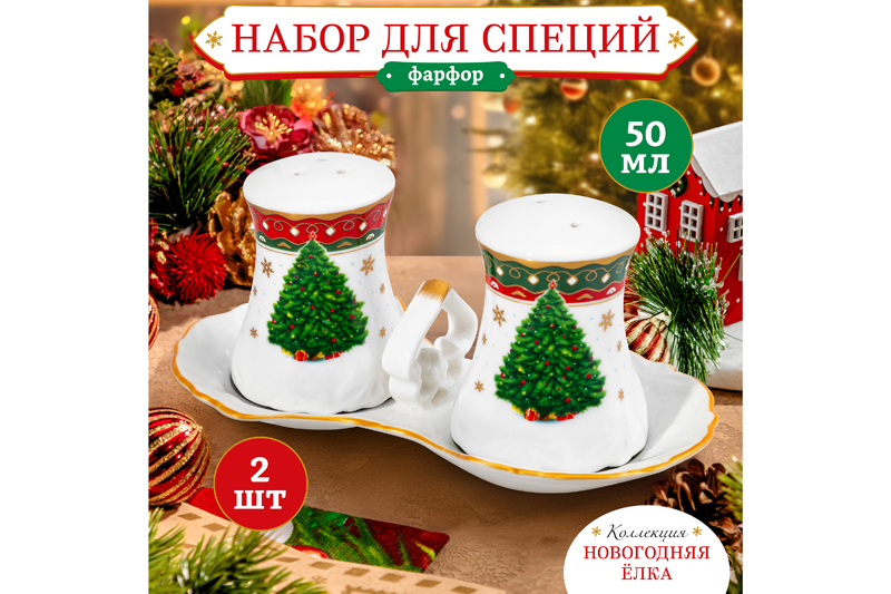 Набор для специй «Новогодняя ёлка» от Elan Gallery предназначен для эстетичной сервировки вашего стола. Общий размер изделия – 16,5х9х7,5 см. Размер каждой ёмкости – 5,4х5,4х6,7 см, объём – 50 мл. Выполнены из фарфора нового поколения new bone china, сочетающего в себе изящность и высокую прочность. Такие изделия легко отмываются, поэтому сохраняют привлекательный вид и практичны в использовании. Плотная структура материала позволяет посуде дольше сохранять температуру блюд и напитков. От других видов костяного фарфора new bone china отличается большей экологичностью в производстве. Поверхность украшена широкой цветной окантовкой, изображением пушистой наряженной ёлочки, узором из снежинок и имбирных пряников. Ёмкости необычной формы позволят держать под рукой все необходимые во время приготовления еды специи и приправы. Фарфоровые контейнеры наполняются через отверстия снизу и закрываются пластиковой пробкой. Поставляются на фарфоровой подставке: удобная ручка позволит подавать её к столу, а углубления под ёмкости обеспечат их устойчивость при переноске. Не рекомендуется применять абразивные моющие средства. Без пластиковых элементов подходят для использования в посудомоечной машине. Поставляются в дизайнерской картонной коробке – благодаря ей вам не потребуется дополнительная подарочная упаковка. Фарфоровая коллекция посуды «Новогодняя ёлка» от бренда Элан Галерея создаст в доме атмосферу волшебства и подарит праздничное настроение. В серии вы найдёте всё необходимое, чтобы встретить праздник в тёплом семейном кругу. Эта коллекция посуды станет приятным подарком вашим близким на Новый год и будет долго напоминать о вашей дружбе! /