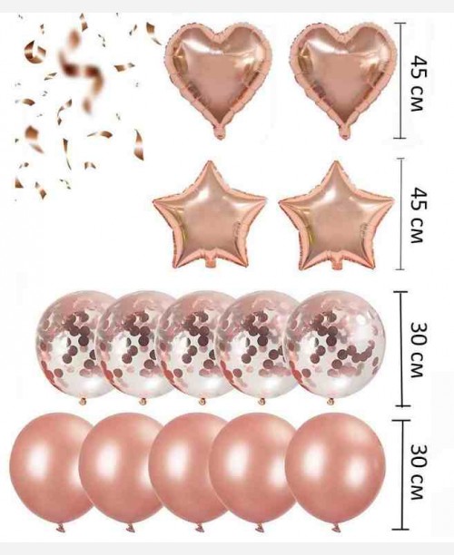 В комплекте: 5 цветных латексных шариков , 5 шариков прозрачных с конфетти, 2 шарика в форме звезды, 2 шара в форме сердца.