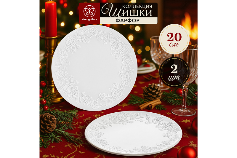 Набор 2 круглых тарелок Elan Gallery "Шишки" выполнен из белого фарфора. Размер каждого изделия — 20,5х20,5х2 см. "Шишки" – это коллекция фарфоровой посуды, вдохновлённая атмосферой хвойного леса. Белоснежная поверхность изделий украшена утончённым рельефом веточек и шишек. Природные мотивы наполнят вашу сервировку уютом и ощущением светлого праздника. Подарите себе мгновения тишины и свежести – с дыханием леса и тонкой красотой в каждой детали. Тарелочки в классическом стиле подойдут к любому интерьеру кухни или гостиной. Можно использовать как десертные или для вторых блюд. Положите на сервировочное блюдце кусочек торта, домашнего пирога или пирожное. Небольшая тарелочка подойдёт для подачи закусок: сырной нарезки, сырокопчёной колбасы или свежих овощей и зелени. Разместите на блюде выпечку и сыр, чтобы перекусить за чашечкой кофе на завтрак. Фарфоровая посуда отличается от керамической повышенной плотностью. Фарфор не впитывает цвет продуктов и не деформируется от влаги, чему может быть подвержена керамика. Блюдечко легко отмывается и долго сохраняет привлекательный вид. Не рекомендуется применять абразивные моющие средства. Можно использовать в микроволновой печи и мыть в посудомоечной машине. Комплект поставляется в стильной картонной коробке. Станет прекрасным подарком на любой праздник. Благодаря стильной коробочке не понадобится дополнительная подарочная упаковка! Красивые блюдца восхитят ваших гостей и добавят элегантности при сервировке стола как в будни, так и на праздник. Коллекция "Шишки" позволит собрать сервиз в едином стиле и станет настоящим украшением вашей кухни! /