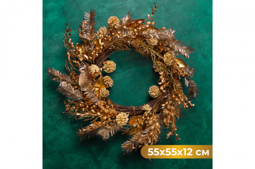Новогоднее украшение в виде венка размером 55х55х12 см от Elan Gallery подарит атмосферу сказки и волшебства вашему дому или офису! Ведь создание праздничной атмосферы начинается с украшения домашнего или офисного интерьера. Композиция с золотистым декором притягивает взгляд гостей на вечеринке с первой минуты. Имеет петлю для подвешивания. Просто повесьте его дома на стену, чтобы превратить в праздник самый обычный день. Такой подвесной веночек круглой формы создаст новогоднюю атмосферу и поможет почувствовать дух Рождества в каждой квартире. Круглый рождественский венок на прочной основе украшен блестящими декоративными элементами. Украсьте венком входную дверь, придавая ей праздничный вид, чтобы тепло поприветствовать гостей. Можно использовать как настенный или настольный декор в любом помещении. С венком можно создать декоративную композицию на камине, столе или дверце. Оформление комнаты веночками создает уютную рождественскую атмосферу на празднике или семейном ужине. Станет приятным подарком для близких и друзей на Новый год или Рождество. Пусть новогоднее украшение в форме круга станет символом домашнего очага и вашей дружбы! В ассортименте Elan Gallery вы найдёте много предметов декора, праздничных аксессуаров и сувениров, а также товары для создания комфорта и уюта в вашем доме. /