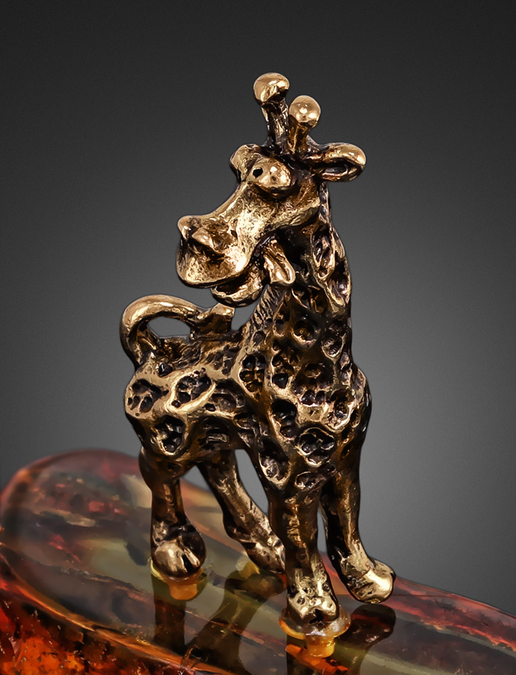 Поставьте этого забавного жирафа там, где вы будете его всегда видеть — и заряд позитива на каждый день вам обеспечен. Невозможно без улыбки смотреть на этот сувенир, который мы создали из тёплого балтийского янтаря и отличного настроения. Фигурку можно разместить не только в любой части интерьера, но даже на приборной панели в машине.