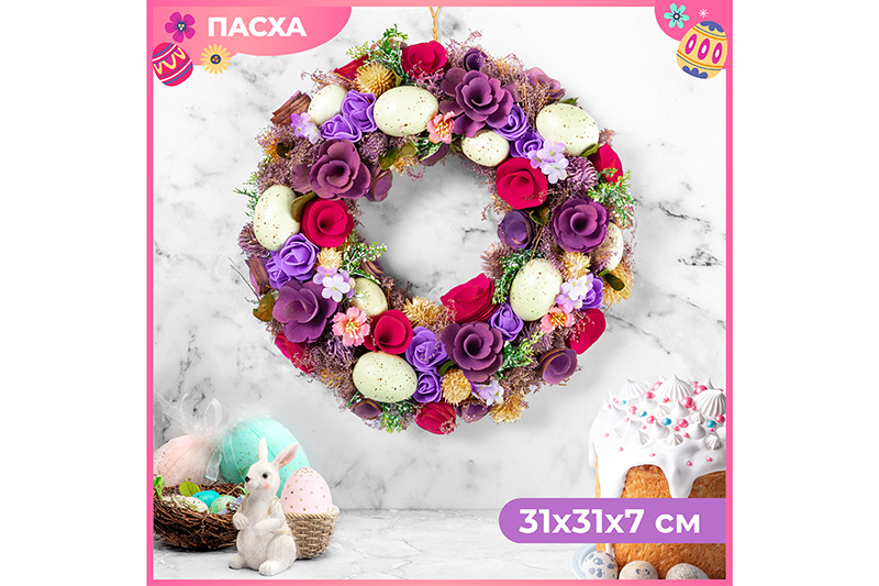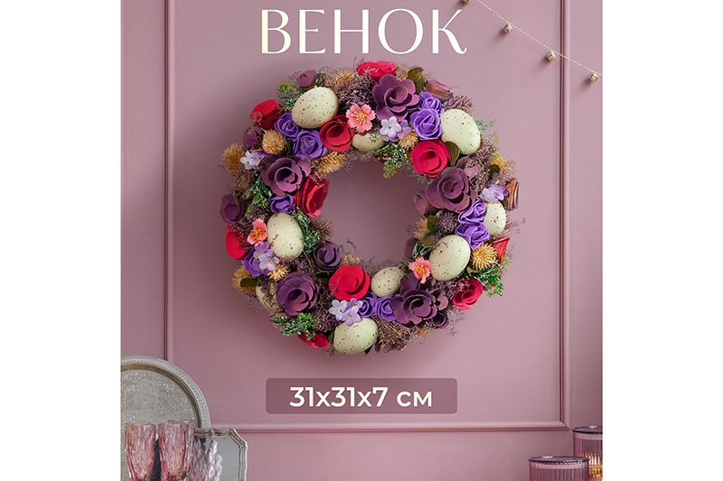 Венок «Весенний сад» от Elan Gallery станет изящным дополнением вашего интерьера. Размер изделия – 31х31х7,5 см. Представляет собой композицию из сухоцветов, декоративных цветочков и искусственных веточек. Выполнен в оттенках фиолетового, розового, зелёного и жёлтого. Посреди цветов расположились искусственные, но очень реалистичные перепелиные яички. Не имеет петельки для подвешивания. Светлая Пасха – один из главных праздников весны! Мы разработали коллекцию сезонных товаров для дома, которые помогут создать радостную и уютную атмосферу в квартире или на даче. Пасхальный декор преобразит домашний интерьер и поможет встретить праздник в кругу любимых. Поставьте его на стол, полку или подоконник, оперев о стенку или окно. Повесьте на дверь, шкаф или свободный крючок, чтобы изделие всегда было на виду и радовало глаз. Сделайте частью праздничного стола, чтобы привнести ощущение чуда. Задействуйте в тематическом оформлении с фигурками, статуэтками и венками. Посадите в его центр пасхальных зверьков: зайчиков, курочек и цыплят. Необычный элемент декора найдёт место в любой части вашей квартиры: в прихожей, гостиной, столовой и спальне. Это изящный и лёгкий способ добавить эстетики любому помещению. В коллекции бренда Элан Галерея вы найдёте множество как ярких, так и нежных декоративных украшений – каждый обязательно подберёт сувенир на свой вкус. Они станут чудесным подарком для родных, близких и коллег. Наполните пространство вокруг себя радостью и весенним настроением! /