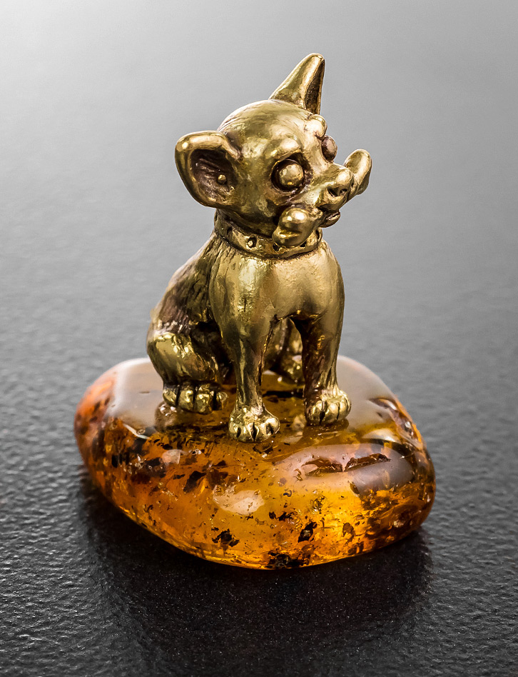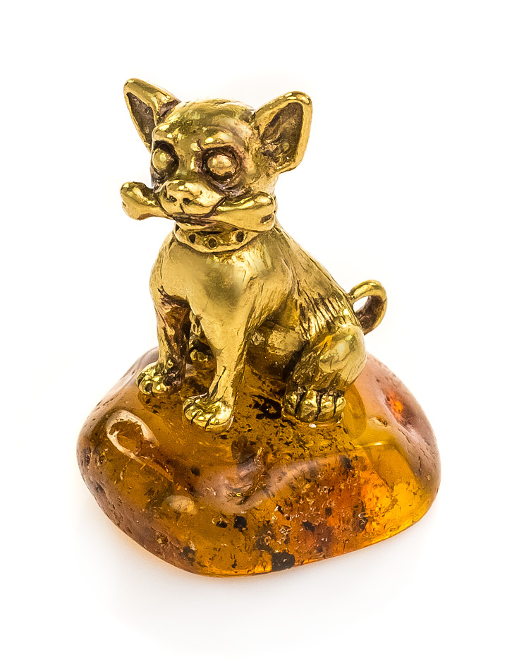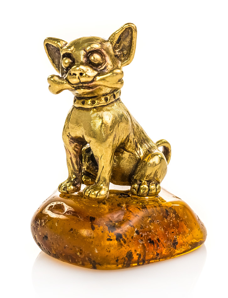 Милая латунная собачка породы чихуахуа на яркой янтарной подставке будет вызывать у вас улыбку и дарить отличное настроение.