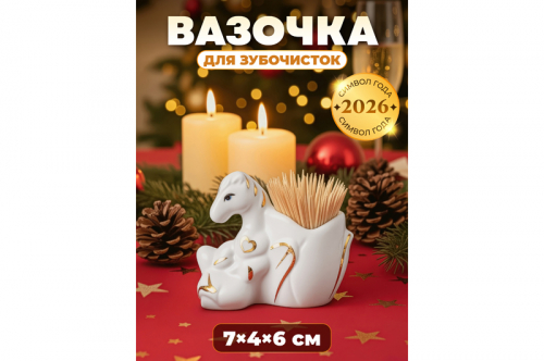 Вазочка под зубочистки «Лошадь» от Elan Gallery предназначена для организации хранения вещей на вашей кухне. Зубочистки не входят в комплект! Размер изделия – 7,5х4,5х6,5 см. Выполнено из высококачественного белого фарфора. Он не впитывает посторонние цвета и легко отмывается, благодаря чему надолго сохранит свою белизну. Представляет собой фигурку маленькой лошади с сердечком, сидящей спиной к цветочному бутону. Изделие украшено золотистыми элементами. Держатель преобразит вашу сервировку и поможет эстетично подавать к столу зубочистки. Лошадь – символ 2026 года! Её образ отражает энергию, свободу и неукротимый дух, вдохновляя на преодоление любых преград. Мы создали коллекцию новогодних и рождественских товаров для сервировки и декора, которые наполнят пространство атмосферой уюта. Изделия помогут оформить интерьер праздничными композициями и добавят нотку зимнего волшебства. Благодаря необычному дизайну стильная настольная статуэтка выступит и самостоятельным элементом декора – она найдёт место в любой части вашего дома. Это эффектный подарок на любой праздник, в том числе на Новый год и Рождество. Не рекомендуется применять абразивные моющие средства. Не подходит для использования в посудомоечной машине и микроволновой печи. Поставляется в яркой картонной коробке – благодаря ей вам не потребуется дополнительная подарочная упаковка. В ассортименте бренда Элан Галерея вы найдёте множество полезных товаров для дома, которые станут уникальным дополнением любого интерьера! /
