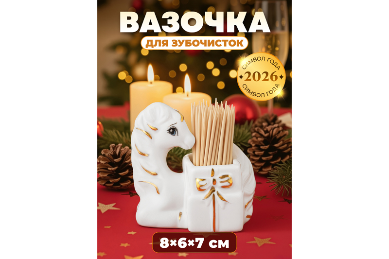 Вазочка под зубочистки «Лошадь» от Elan Gallery предназначена для организации хранения вещей на вашей кухне. Зубочистки не входят в комплект! Размер изделия – 8х6х7,5 см. Выполнено из высококачественного белого фарфора. Он не впитывает посторонние цвета и легко отмывается, благодаря чему надолго сохранит свою белизну. Представляет собой фигурку в виде милой лошадки, лежащей возле подарочной коробки. Изделие украшено золотистыми элементами. Держатель преобразит вашу сервировку и поможет эстетично подавать к столу зубочистки. Лошадь – символ 2026 года! Её образ отражает энергию, свободу и неукротимый дух, вдохновляя на преодоление любых преград. Мы создали коллекцию новогодних и рождественских товаров для сервировки и декора, которые наполнят пространство атмосферой уюта. Изделия помогут оформить интерьер праздничными композициями и добавят нотку зимнего волшебства. Благодаря необычному дизайну стильная настольная статуэтка выступит и самостоятельным элементом декора – она найдёт место в любой части вашего дома. Это эффектный подарок на любой праздник, в том числе на Новый год и Рождество. Не рекомендуется применять абразивные моющие средства. Не подходит для использования в посудомоечной машине и микроволновой печи. Поставляется в яркой картонной коробке – благодаря ей вам не потребуется дополнительная подарочная упаковка. В ассортименте бренда Элан Галерея вы найдёте множество полезных товаров для дома, которые станут уникальным дополнением любого интерьера! В коллекции бренда Elan Gallery представлены подарочные аксессуары, сувениры и украшения с символикой коней и лошадок. Каждый подберёт оригинальный сюрприз для семьи, друзей и коллег на Новый год и Рождество. Такой подарок наполнит дом семейным теплом и духом праздника! /