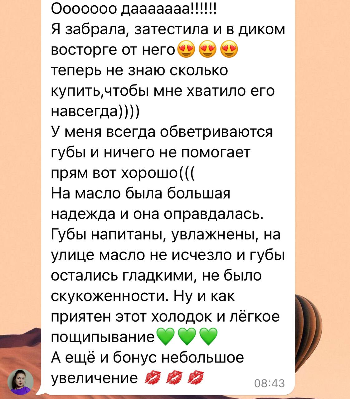 Нежная текстура масла легко ложится на губы, создает ощущение гладких, увлажненных и напитанных губ, комфортно носится, не вызывает ощущения липкости и стянутости.