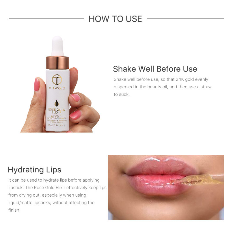 O.TWO.O Rose Gold Elixir не только увлажняет и питает кожу, но и может использоваться для увлажнения губ перед нанесением помады, обеспечивая защиту от высыхания, особенно при использовании матовых помад. Для достижения максимального эффекта дайте маслу полностью впитаться в губы перед нанесением помады.