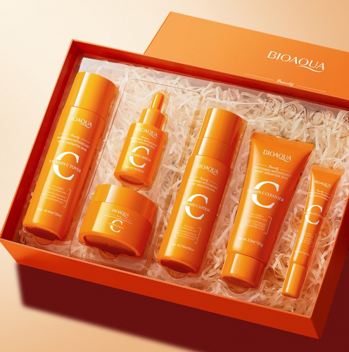В набор входит:1. Пенка для умывания, 100 гр. Очищает и увлажняет кожу. Выдавите на ладонь небольшое количество пенки из тюбика, добавьте воды, чтобы средство слегка вспенилось. Смочите лицо водой, нанесите пенку на влажную кожу, растирайте массирующими движениями 1-2 минуты. Умойтесь тёплой водой.2. Увлажняющий тонер, 120 мл. Нанесите тоник на сухое очищенное лицо при помощи ватного диска. Используйте утром и вечером. Избегайте область вокруг глаз.3. Крем вокруг глаз, 20 гр. Борется с сухостью кожи вокруг глаз, возвращает ей упругость. Нанести небольшое количество крема на область вокруг глаз и распределить подушечками пальцев до полного впитывания.4. Сыворотка, 30 мл.На очищенное лицо нанести 2-3 капли сыворотки и массажными движениями вбить ее в кожу. Подождите несколько минут и дайте время впитаться. Использовать рекомендуется перед сном ежедневно. При регулярном применении сыворотки можно достичь наибольшего эффекта.5. Увлажняющее молочко (лосьон), 80 мл. Делает кожу сияющей. На очищенное лицо нанесите несколько капель на лицо, мягко помассируйте до полного впитывания.6. Крем против морщин, 60 гр.Нанести небольшое количество крема на кожу лица и распределить подушечками пальцев до полного впитывания.м С и экстрактом цитрусов BIOAQUA - это полноценный набор, который способствует регенерации клеток, выполняет защитную и омолаживающую функцию, повышает эластичность и упругость эпидермиса, выравнивает тон и рельеф, устраняет пигментацию. Активный помощник в борьбе с воспалениями и постакне, он сужает поры и нормализует работу сальных желёз.