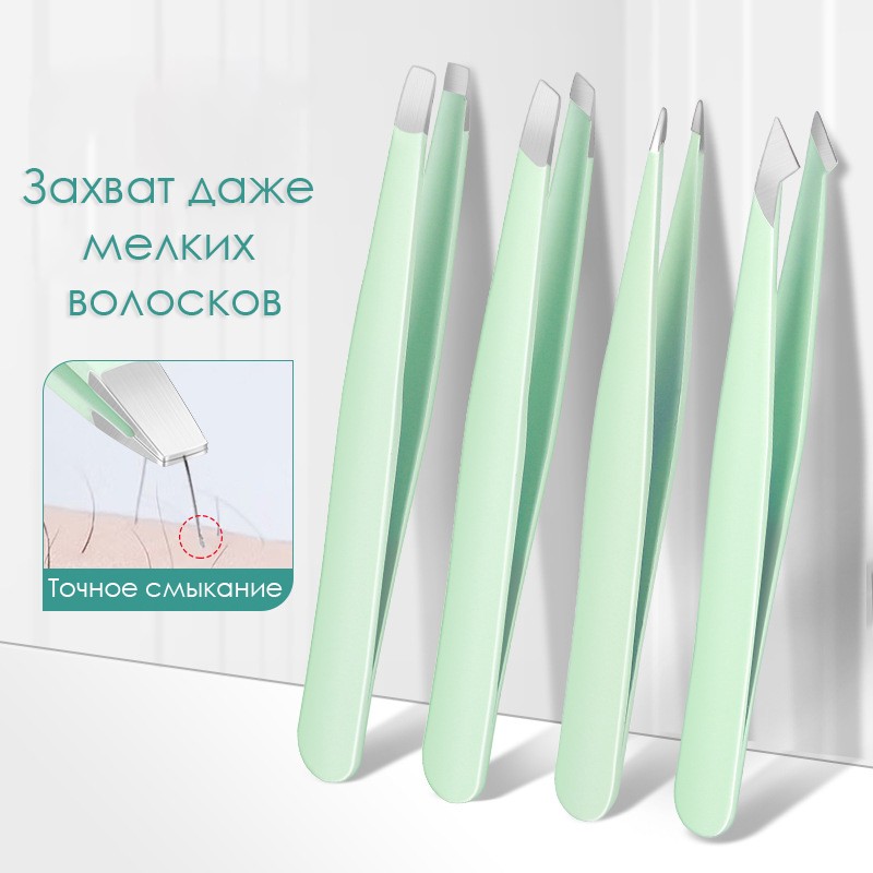 Набор пинцетов для бровей и ресниц 4 шт. в кожаном чехле. Цвет: Мята