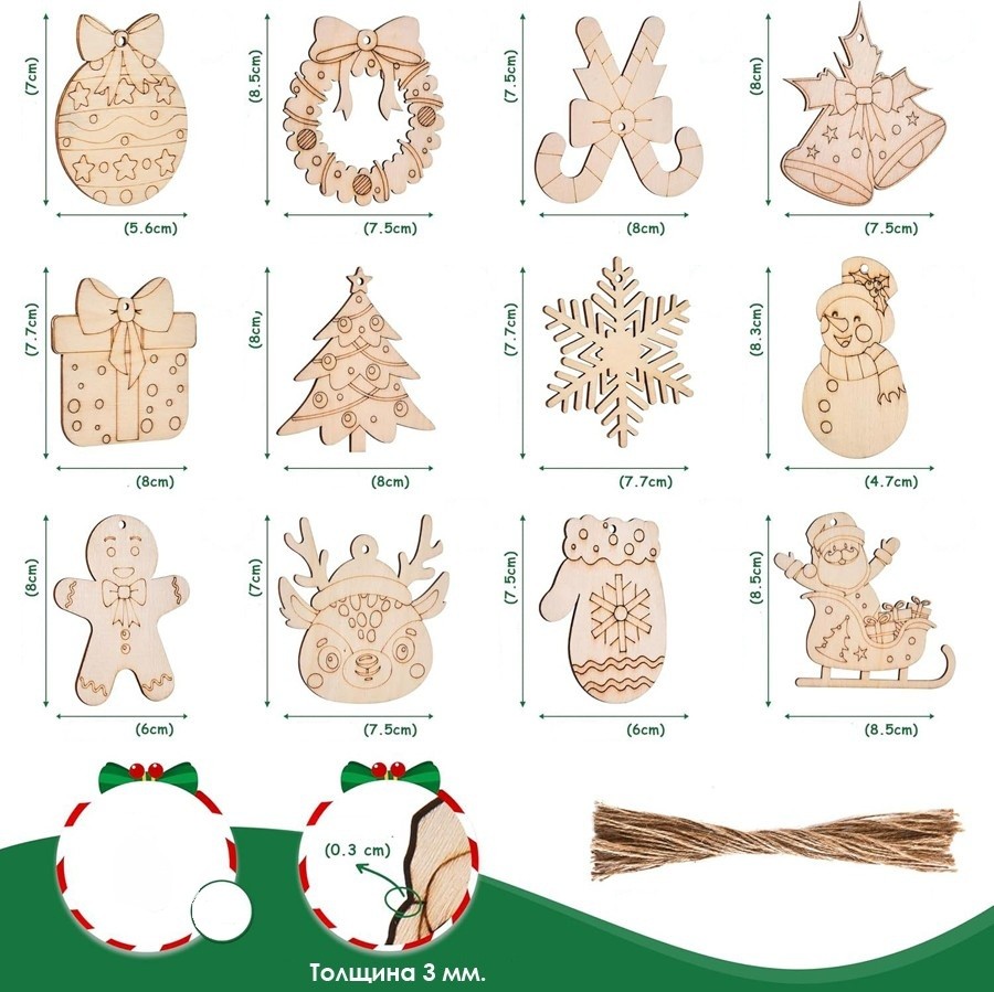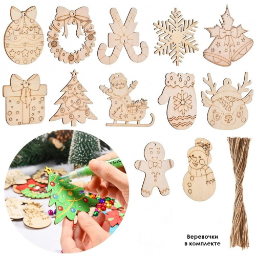 В комплект входят: 12 деревянных новогодних фигурок, а также 12 веревочек для подвешивания.Материал изготовления: тополь.и игрушками, которые не только добавят праздничного настроения, но и позволят вам проявить творческий подход.