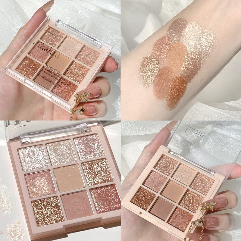 Палитра теней для век Dikalu состои..показатьт из 9 гармонично сочетающихся друг с другом оттенков для создания твоего идеального образа!Они легко наносятся аппликатором, кистью или пальцем. Тени легко наносятся и растушевываются, не скатываются и не осыпаются.
