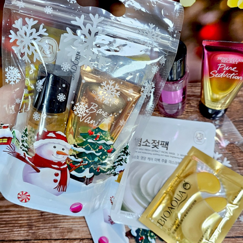 Подарочный набор в красном пакете "Олень и Дед Мороз" (3 маски + Носочки + Бальзам + Крем для рук)