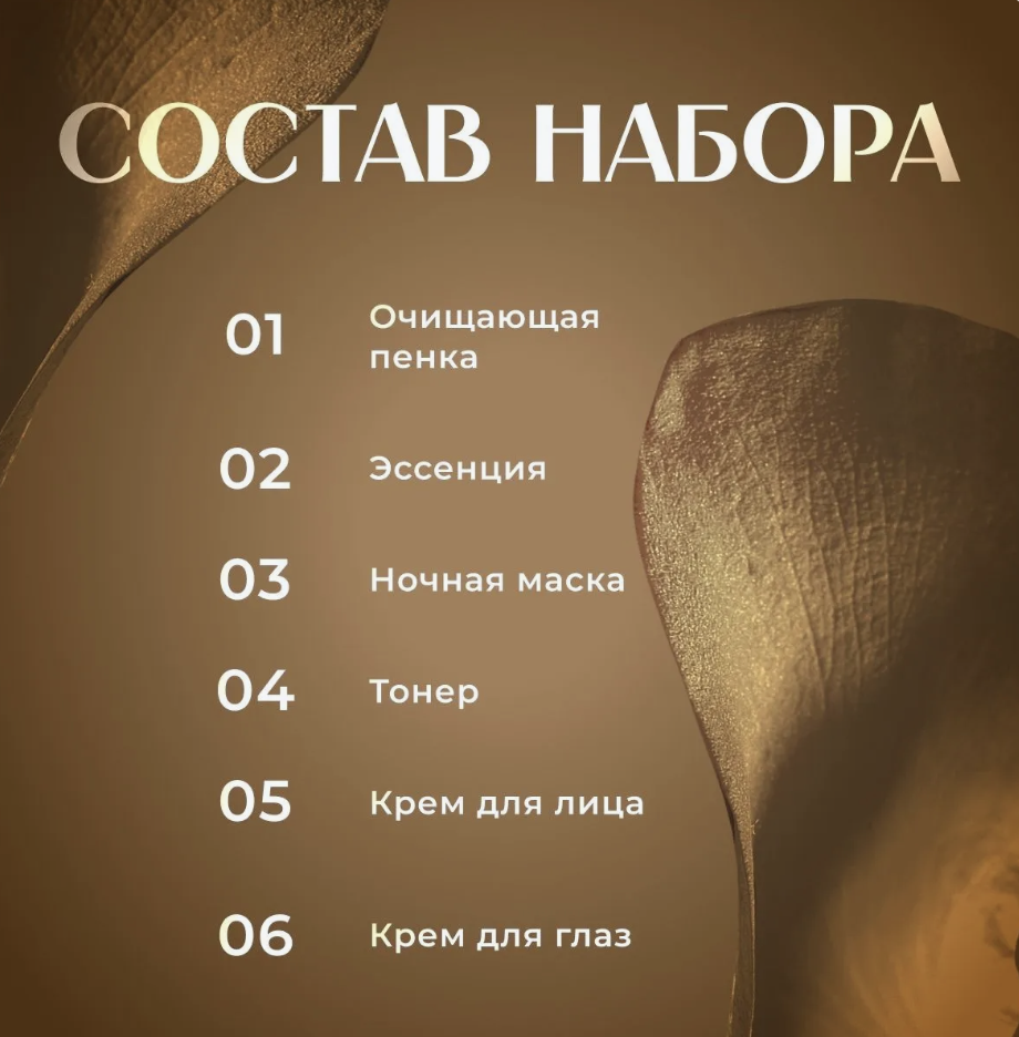 Очищающее молочко - 80г; Эссенция-тонер - 120мл; Крем для век - 20 г; Ночная маска - 30г; Эссенция-лосьон - 120мл; Эссенция-крем - 50 г