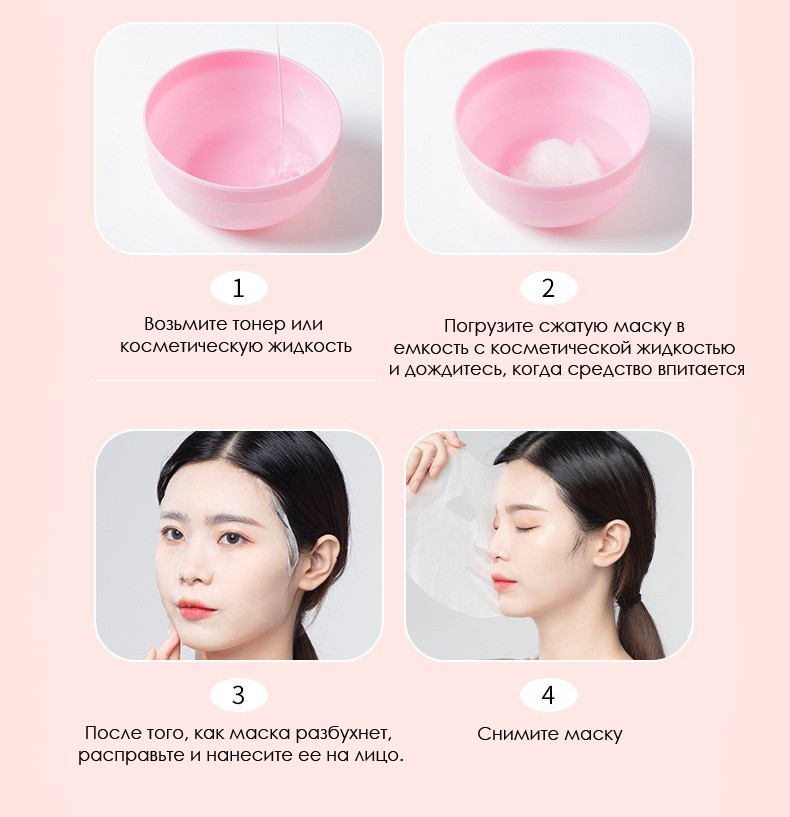 Как использовать маску?В применении товара нет ничего сложного. Вскройте индивидуальную упаковку маски - таблетки, погрузите ее в емкость с сывороткой или другой косметической жидкостью и дождитесь, когда средство впитается. После того, как маска разбухнет, расправьте маску и нанесите на лицо. После этого необходимо ждать порядка 15-30 минут – зависит от быстроты действия жидкого средства. По истечению этого времени можно снимать маску.позволит сделать собственную маску для лица в домашних условиях.
