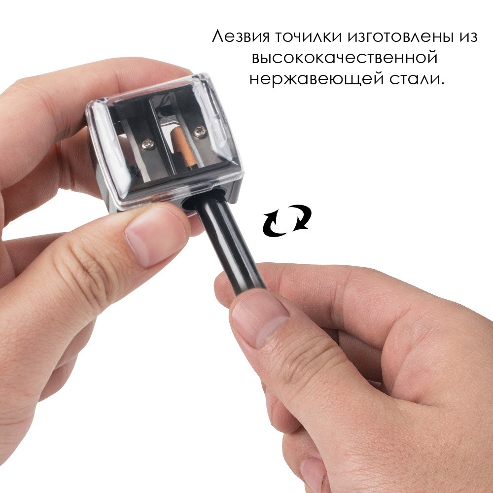 Способ применения: Вставьте карандаш в подходящий разъем. Плавно поворачивайте карандаш, пока не получите нужную остроту. Стружка останется в контейнере – просто выбросьте её и закройте крышку. ских карандашей с 2 отверстиями разного диаметра (8 мм. и 12 мм.) с полупрозрачным колпачком и прочным стиком для очистки лезвий.
