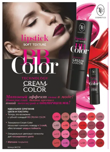 Помада для губ TF BB Color Lipstick дарит улыбке безупречную матовость, которая неизменно остаётся в моде. Эксперты модного бренда TF разработали потрясающее средство, которое подарит вашим губам соблазнительность и притягательность. BB Color Lipstick радует превосходной стойкостью, лёгкой насыщенной текстурой, которая ровно ложится на поверхность покрова губ с первого же нанесения. Абсолютно не требует повторного слоя. Хорошо распределяется по поверхности кожи, плотно покрывает и дарит интенсивный, глубокий и чувственный пигмент. Формула помады для губ совершенно уникальная, оказывает настойчивую заботу и уход. Для более глубокого эффекта, прорисуйте сначала контур губ, и следом нанесите губную помаду. Имеет тон №133. TALC,MICA,MAGNESIUM STEARATE,ETHYLHEXYL PALMITATE,MINERAL OIL,DIMETHICONE,METHYLPARABEN,PROPYLPARABEN,BHT.May contain CI 15850,CI 19140,CI 45410,CI 77007,CI 77266,CI 77491,CI 77492,CI 77499,CI 77742,CI 77891.